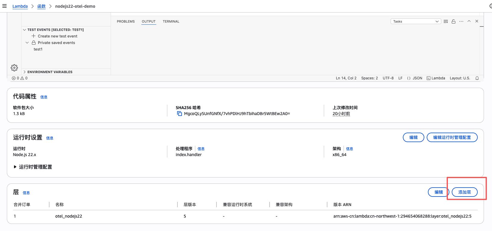 在 Demo 函数中添加 Layer,选择指定一个 ARN ,将刚才的 ARN 复制进去,点击「添加」。