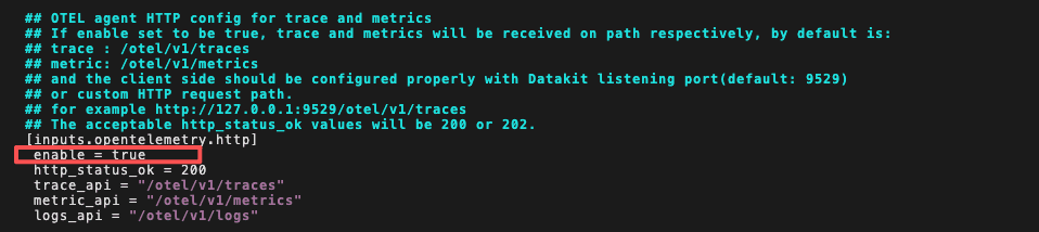 编辑 opentelemetry 配置文件,修改如下部分,添加 enable = true ,然后保存。