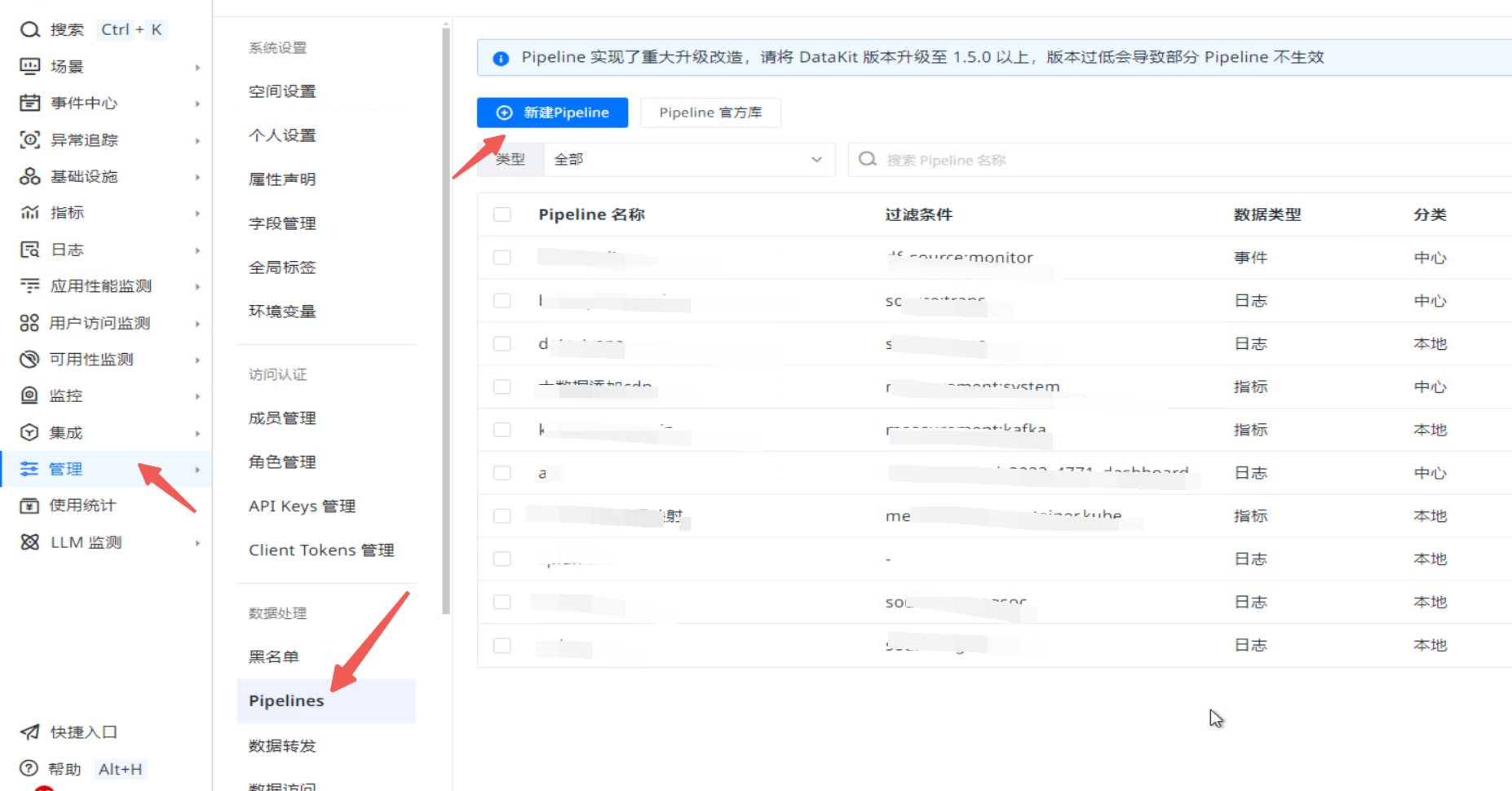 通过观测云管理菜单下面的 Pipeline 菜单进入 Pipeline 菜单管理页面(因为是需要对指标数据进行 Pipeline 处理,只能通过该菜单进入才能创建处理指标的 Pipeline),并创建一个新的 Pipeline。