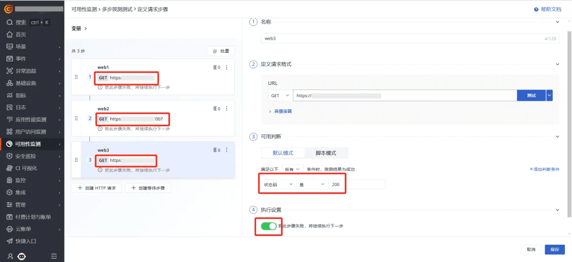 如下图创建了三步拨测,在“可用判断”中选择“状态码”,值输入“200” ,“执行步骤”中打开“若此步骤失败,将继续执行下一步”,这样就能保证每次拨测,都能把所有步骤执行完成。