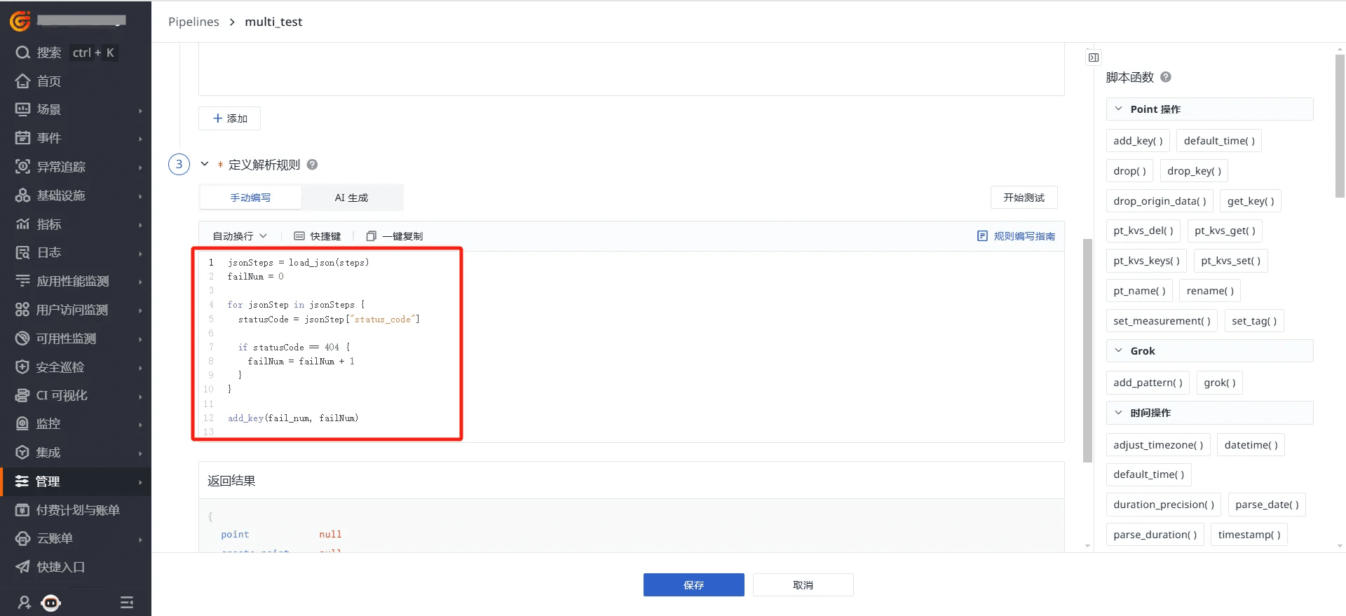 登录观测云控制台,点击「管理」 -「Pipelines」 - 「新建Pipeline」,运行模式选择“中心pipeline”,数据类型选择“可用性监测”,数据来源选择“multi_dial_testing”,解析规则填写如下内容,把所有步骤中失败的条数统计出来。