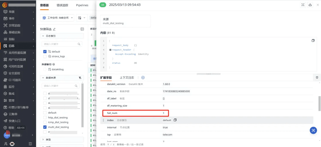 在「日志」 -「查看器」,选择数据来源“multi_dial_testing”,点击一条日志,在扩展字段中可以看到“fail_num”已经被统计出来。