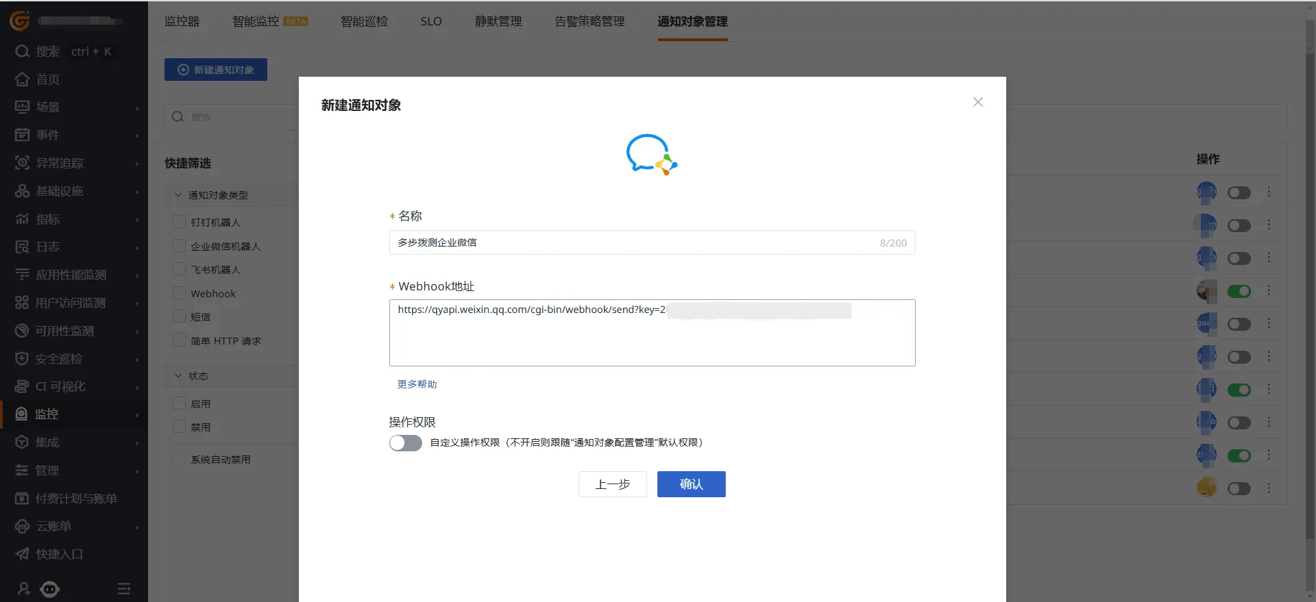 登录观测云控制台,点击「监控」 -「通知对象管理」 - 「新建通知对象」,选择“企业微信机器人”,输入企业微信机器人的 webhook。