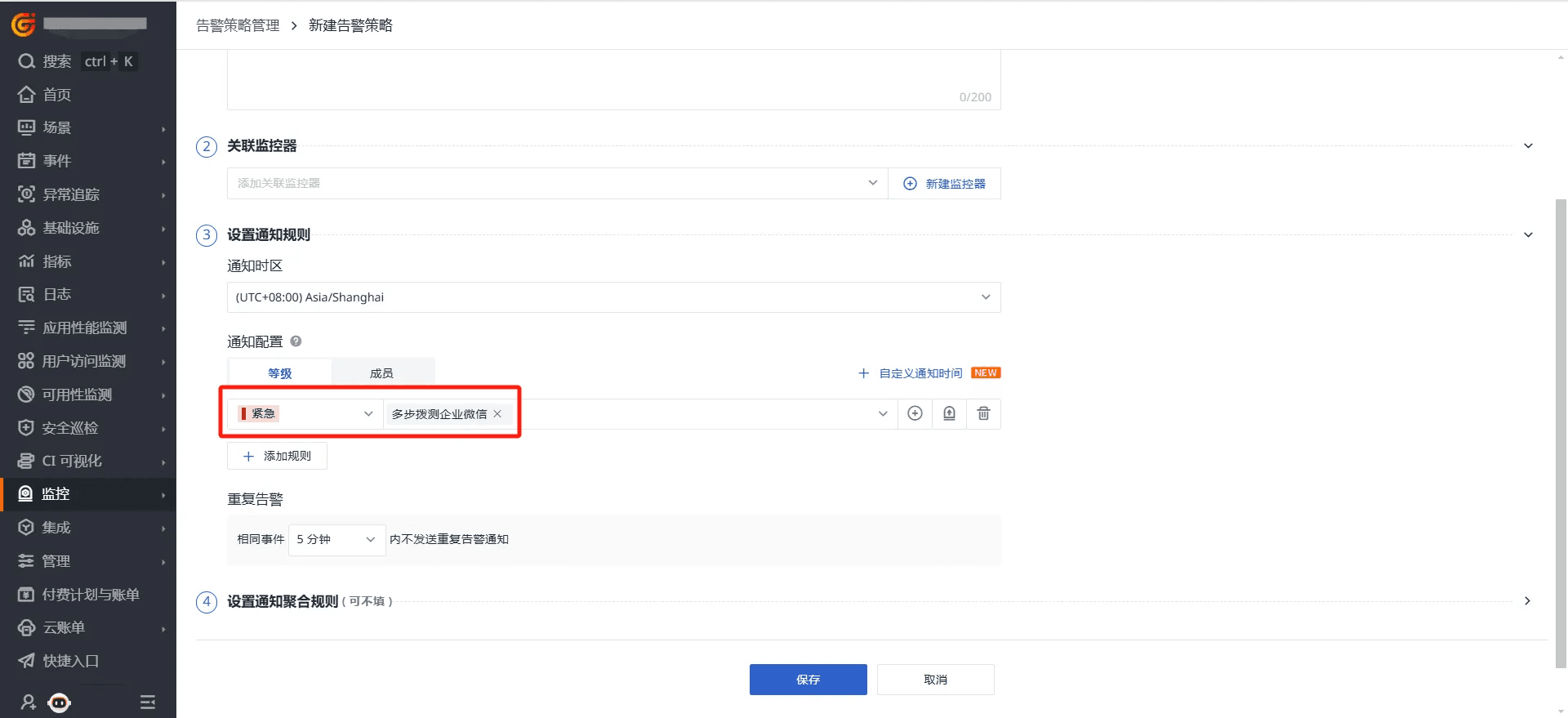 登录观测云控制台,点击「监控」 -「告警策略管理」-「新建告警策略」,通知配置规则中选择“紧急”,值选择刚创建的通知对象。