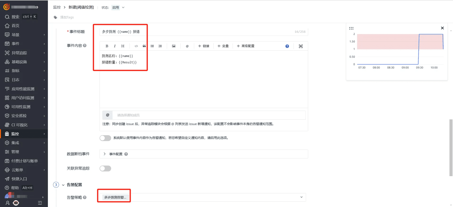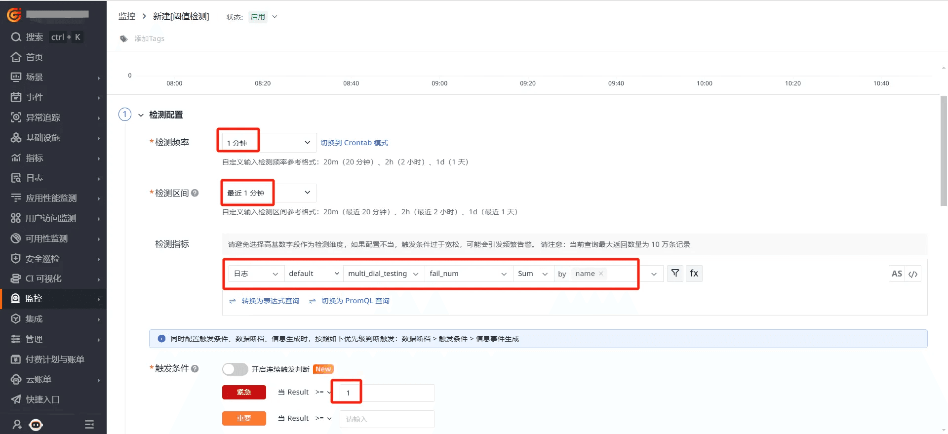 登录观测云控制台,点击「监控」 -「新建监控器」,选择“阈值检测”,“检测指标”选择日志,示例中就是按照拨测名的维度统计“fail_num”的数量,在检测区间内数量大于等于 1 触发告警。