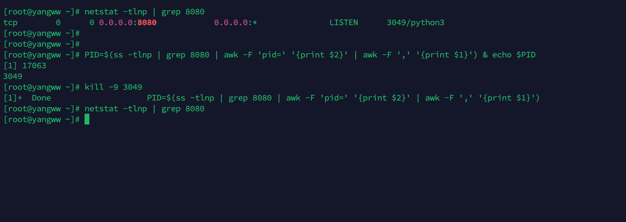 查找服务器上 8080 服务端口对应的运行进程,手动模拟进程关闭,触发端口异常场景。