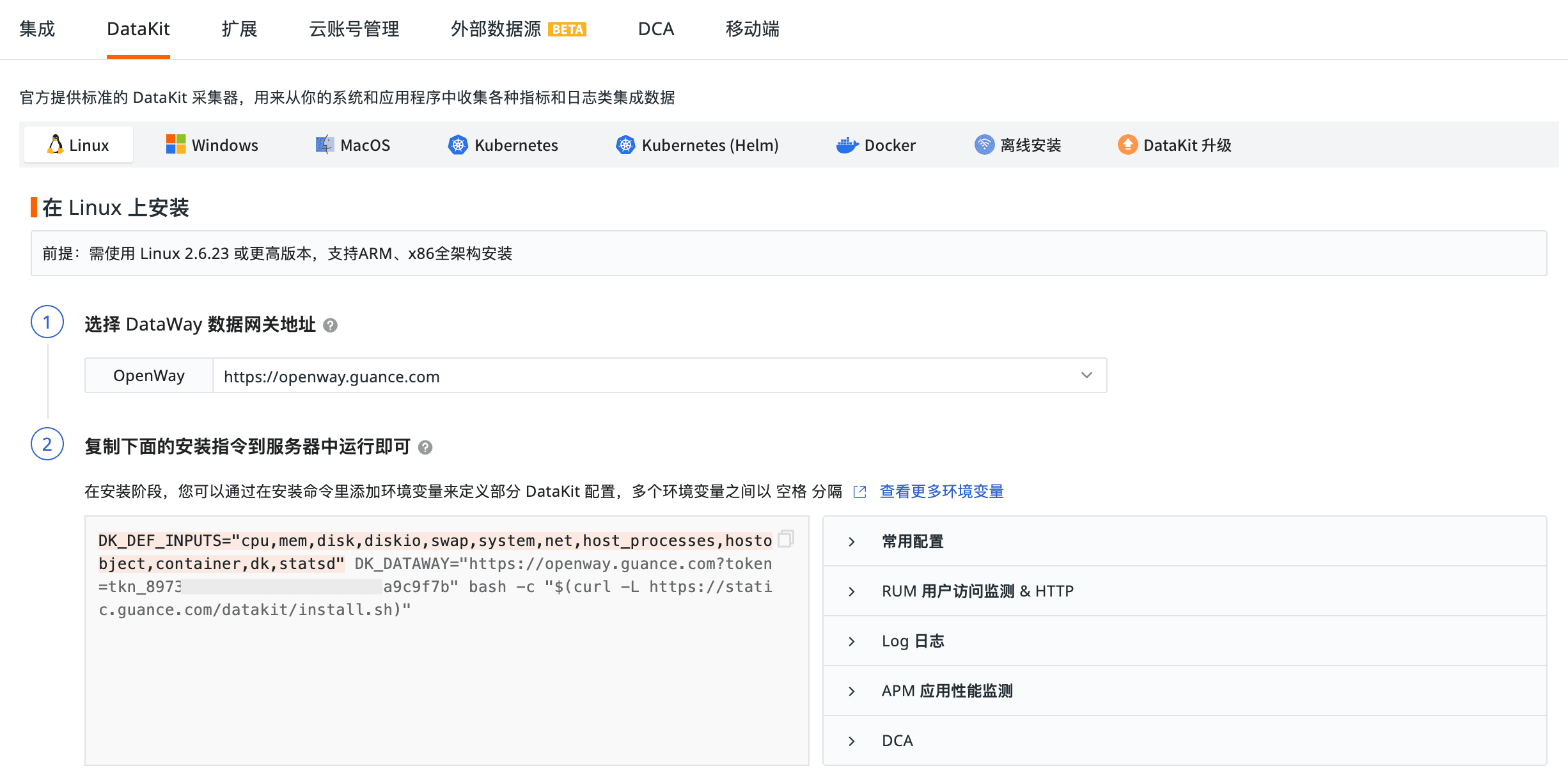 登陆观测云控制台,点击左侧「集成」选择顶部「DataKit」,即可看到各种方式的安装命令。