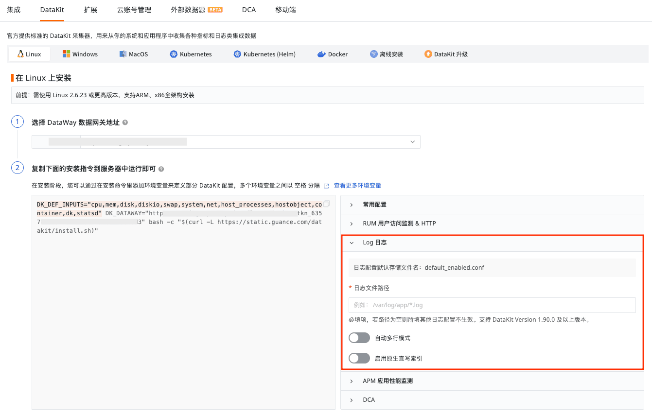 安装配置页面:新增 “LOG 日志”配置模块。添加文件路径采集日志配置,该配置项下同步新增自动多行模式、启用原生直写索引等选项。