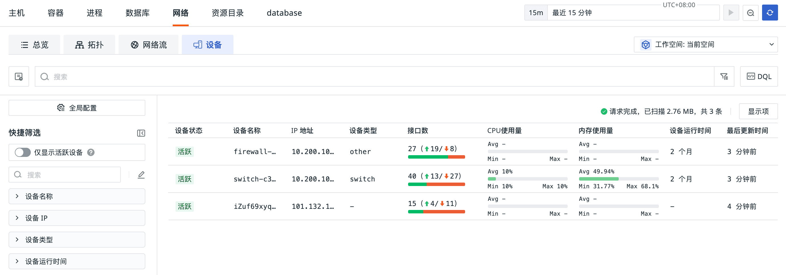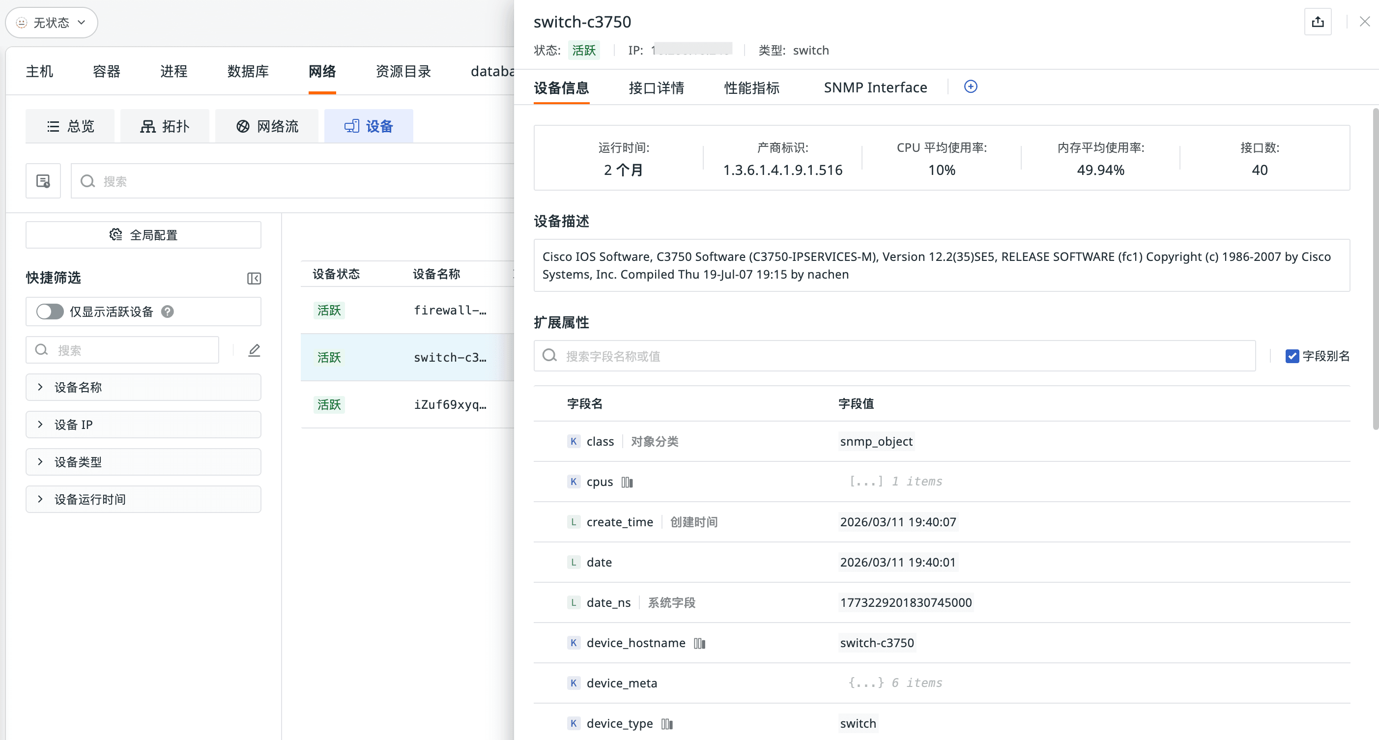 - 设备详情页提供设备信息、接口详情、性能指标三大视图