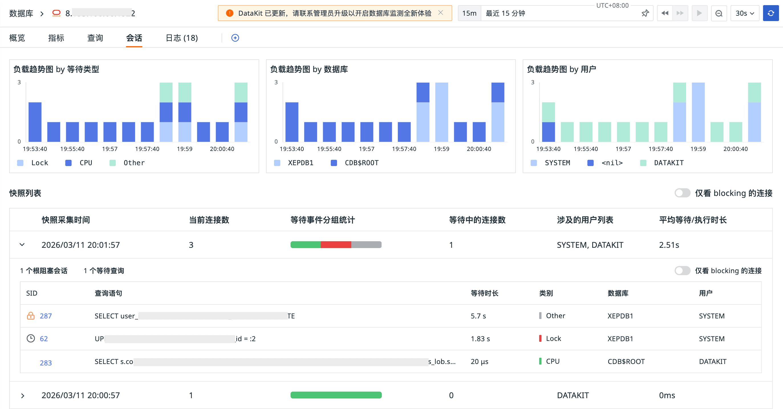 - 会话:会话阻塞分析,自动识别阻塞链(Root Blocker/Waiter)