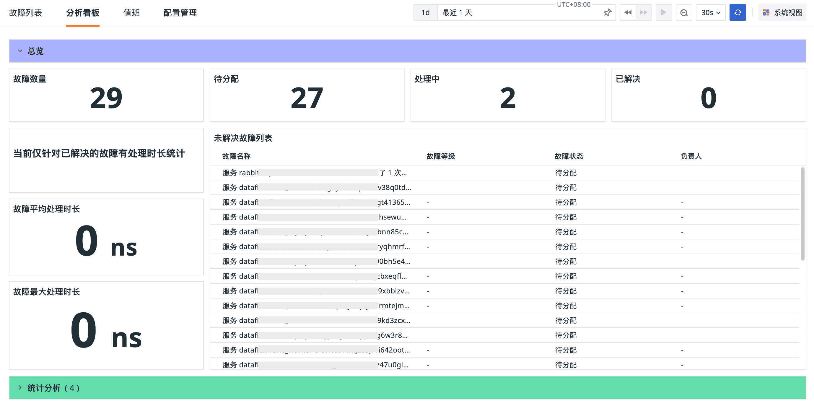 故障中心新增“分析看板”页面,提供故障全生命周期的可视化统计分析能力。