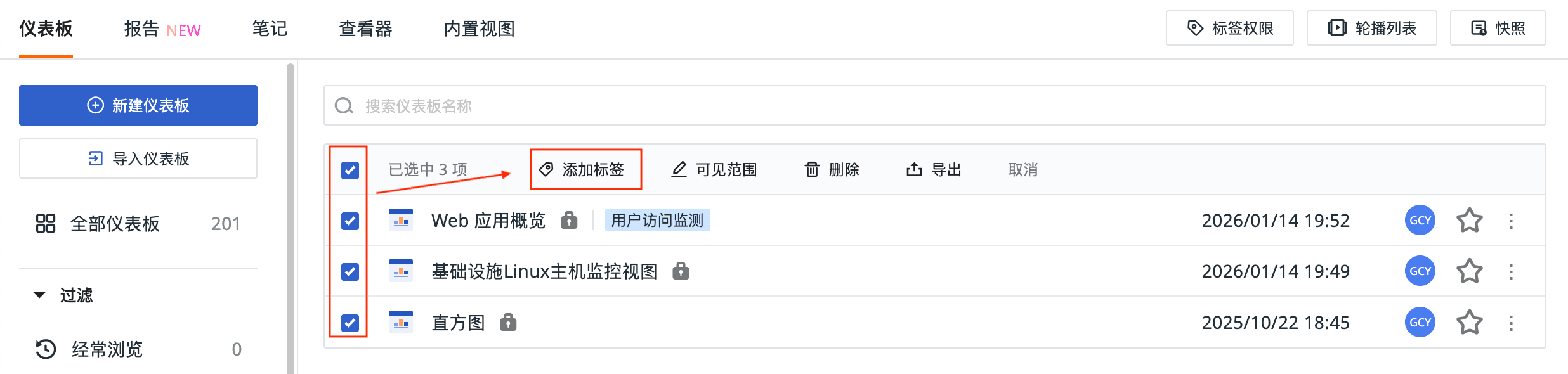 1、新增支持批量为仪表板添加标签;