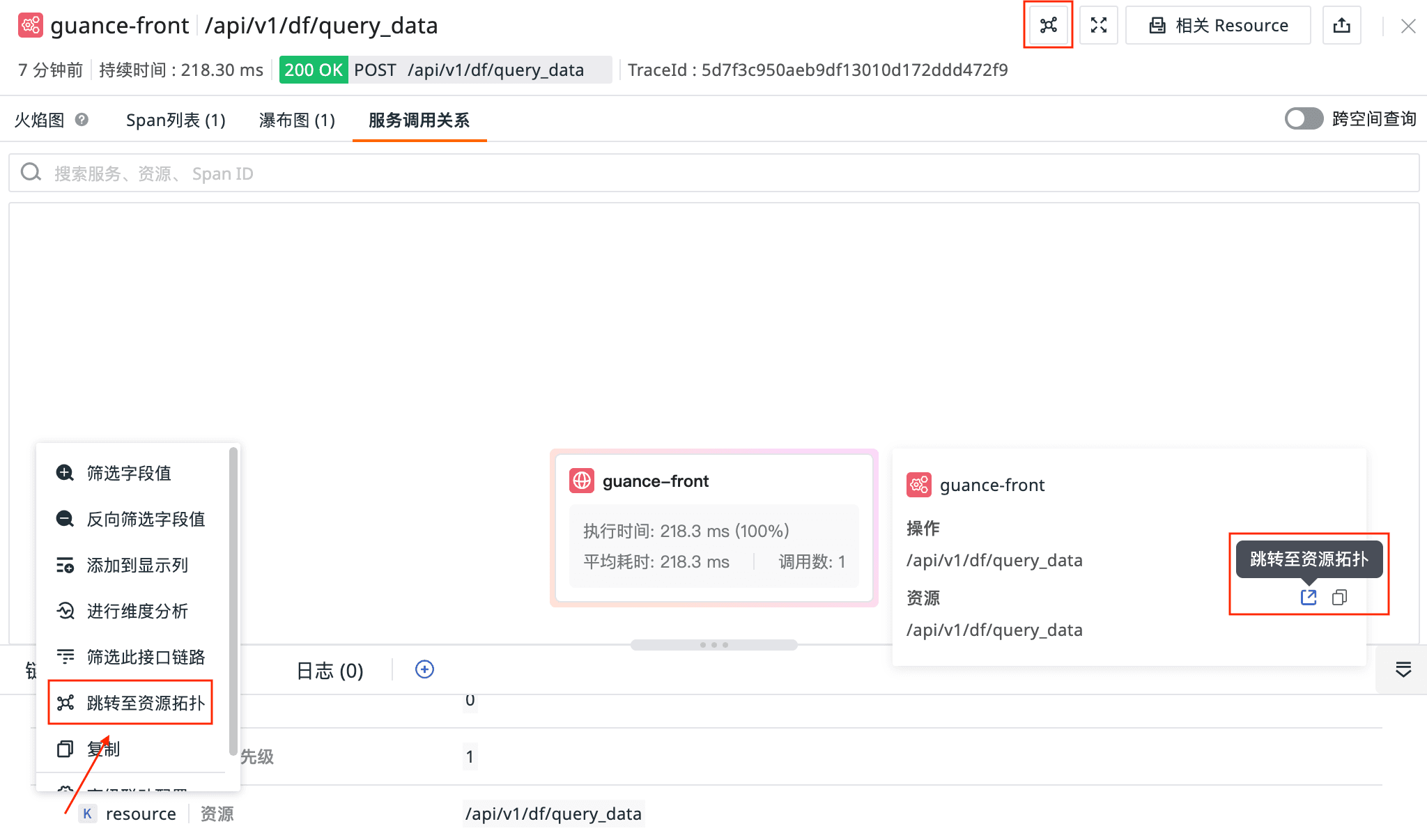 1、链路详情页右上角、详情页 resource 字段 > 服务调用关系 > 服务卡片新增关联资源拓扑,点击可跳转至拓扑页;