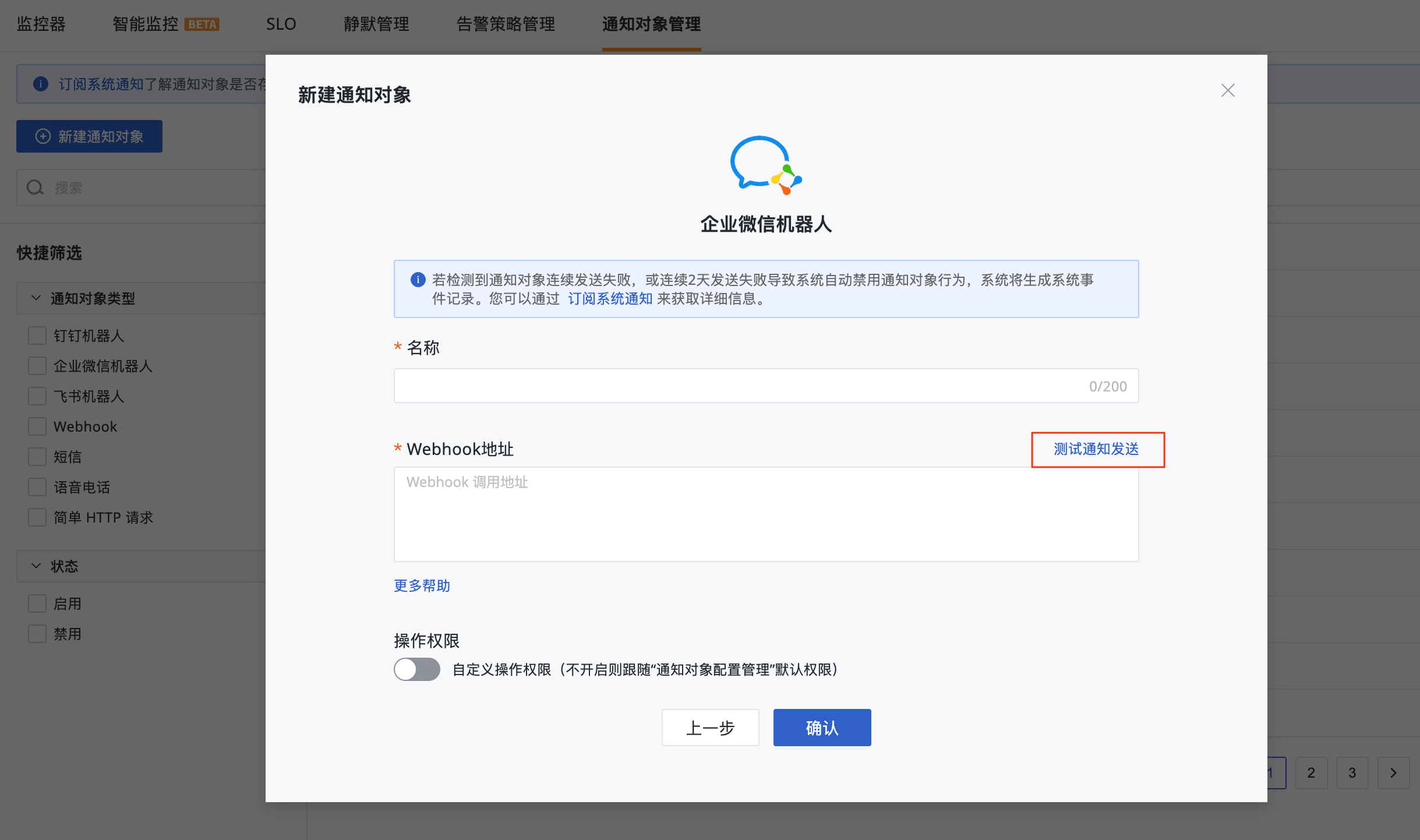 2、新增测试通知按钮,支持验证通知渠道是否可达。