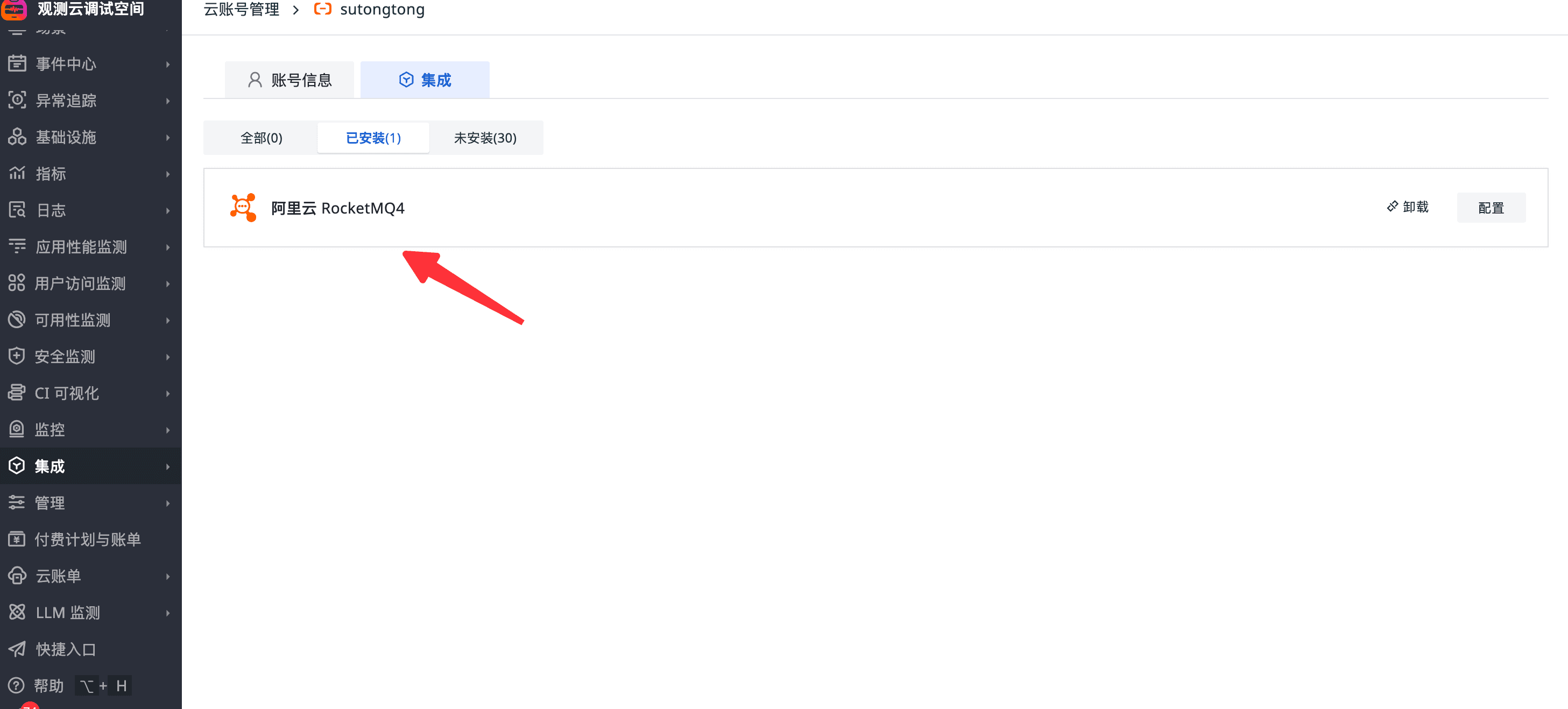 - 点击云账号详情页的【集成】按钮,在未安装列表下,找到阿里云 RocketMQ 4.0,点击【安装】按钮,弹出安装界面安装即可。