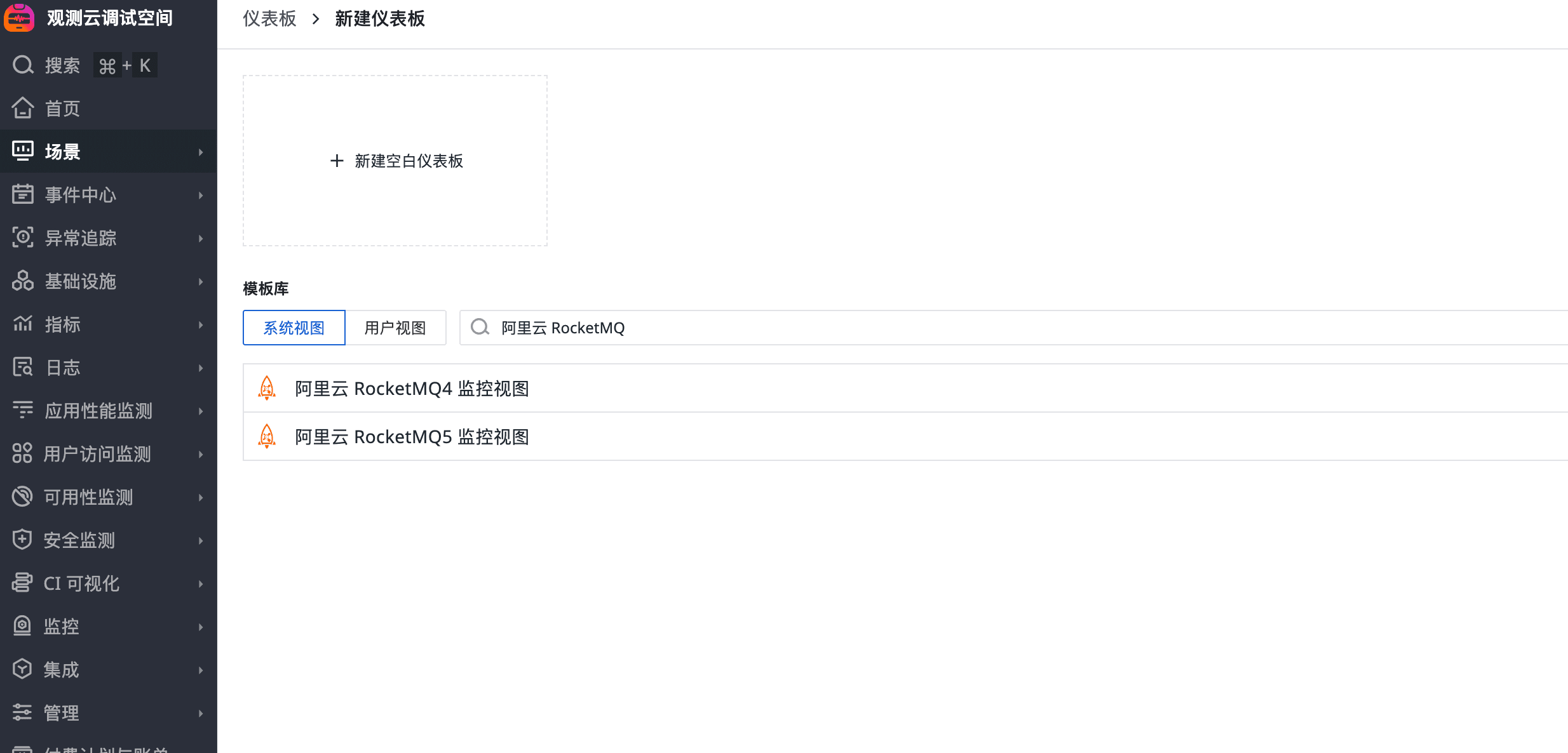 登录观测云控制台,点击「场景」 -「新建仪表板」,输入 “阿里云 RocketMQ”, 选择 “阿里云 RocketMQ4监控视图”,点击 “确定” 即可添加视图。