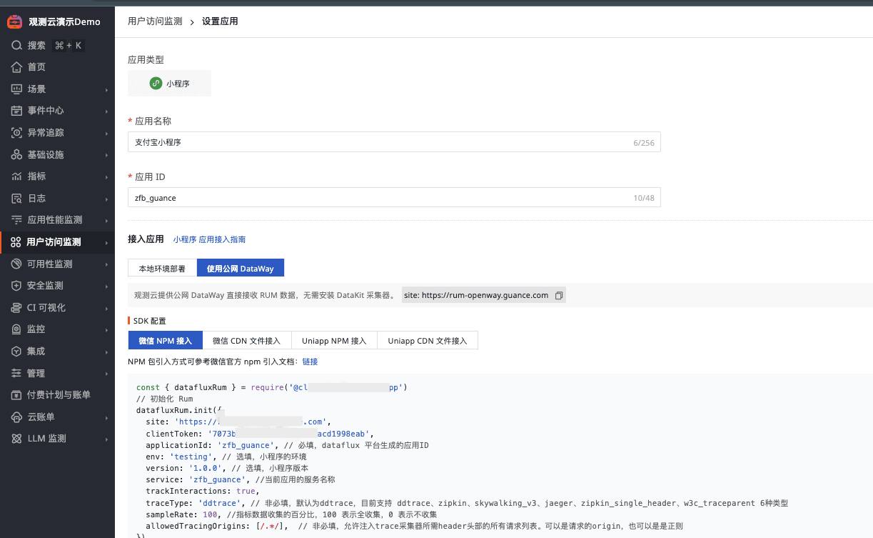 1、观测云后台->用户访问监测->新建应用,选择应用类型为小程序,输入应用名称、应用ID,系统会自动根据配置信息生成引入 SDK 的代码,可选择 NPM 接入或 CDN 文件接入(这里我们选择 CDN 文件方式接入)。