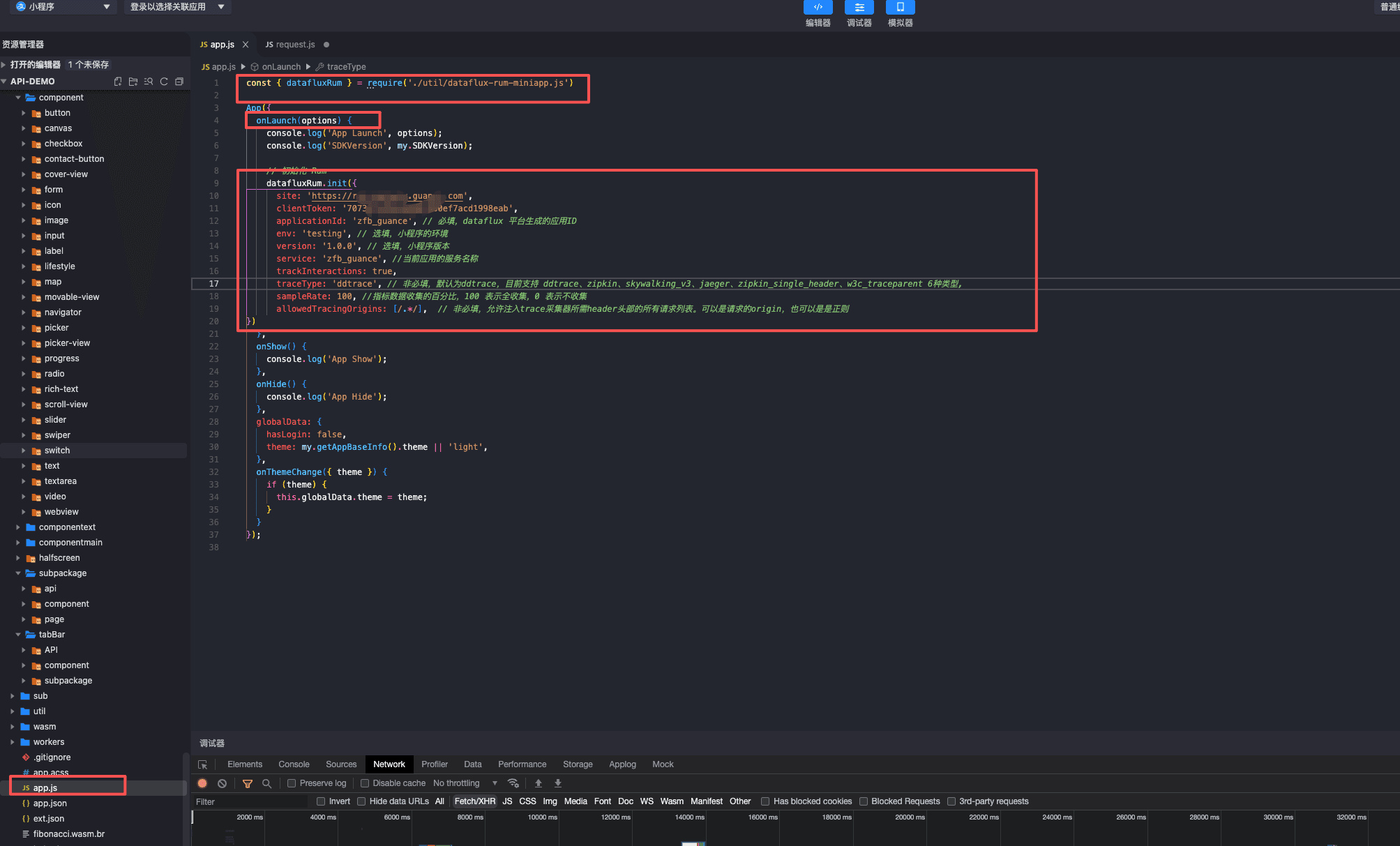 2、根据链接下载 CDN 文件,打开项目代码,在小程序项目中的 app.ts 入口文件引入观测云后台生成的配置代码。