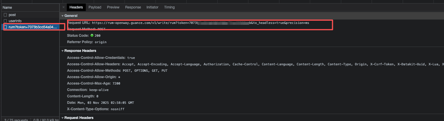 3、本地运行项目或者打包发布测试后,通过观察接口调用发现 /v1/write/rum 接口成功调用,说明数据成功上报,可在对应应用的查看器查看上报数据。