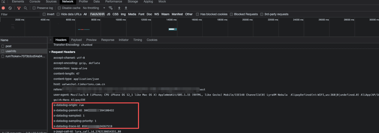 4、js 会自动生成一个 trace_id,如果在 allowedTracingOrigins 配置了正则(本最佳实践中配置的是 *,意味着所有接口都会带 ),会在对应的请求头中加入一些参数,ddtrace 的是这几个参数。